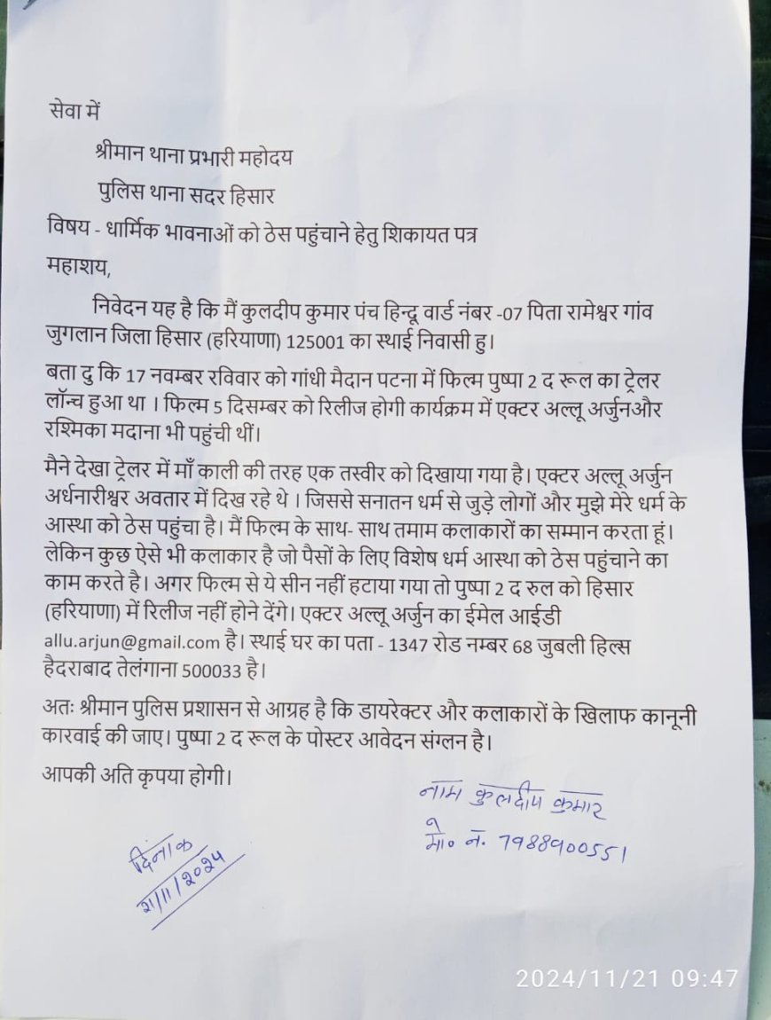 कुलदीप कुमार ने हिसार थाने में मेकर्स और एक्टर्स के खिलाफ शिकायत दर्ज करवाई है। उनका कहना है कि अल्लू अर्जुन के इस रूप ने सनातन धर्म के अनुयायियों की भावनाओं को आहत किया है। उन्होंने यह भी आरोप लगाया कि कुछ कलाकार पैसे के लिए धार्मिक भावनाओं को ठेस पहुंचाते हैं। शिकायत में यह चेतावनी दी गई है कि अगर विवादित सीन फिल्म से नहीं हटाया गया तो हरियाणा के हिसार में इसे रिलीज नहीं होने दिया जाएगा।